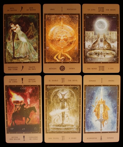 Seis cartas de tarot com ilustrações e texto multilingue