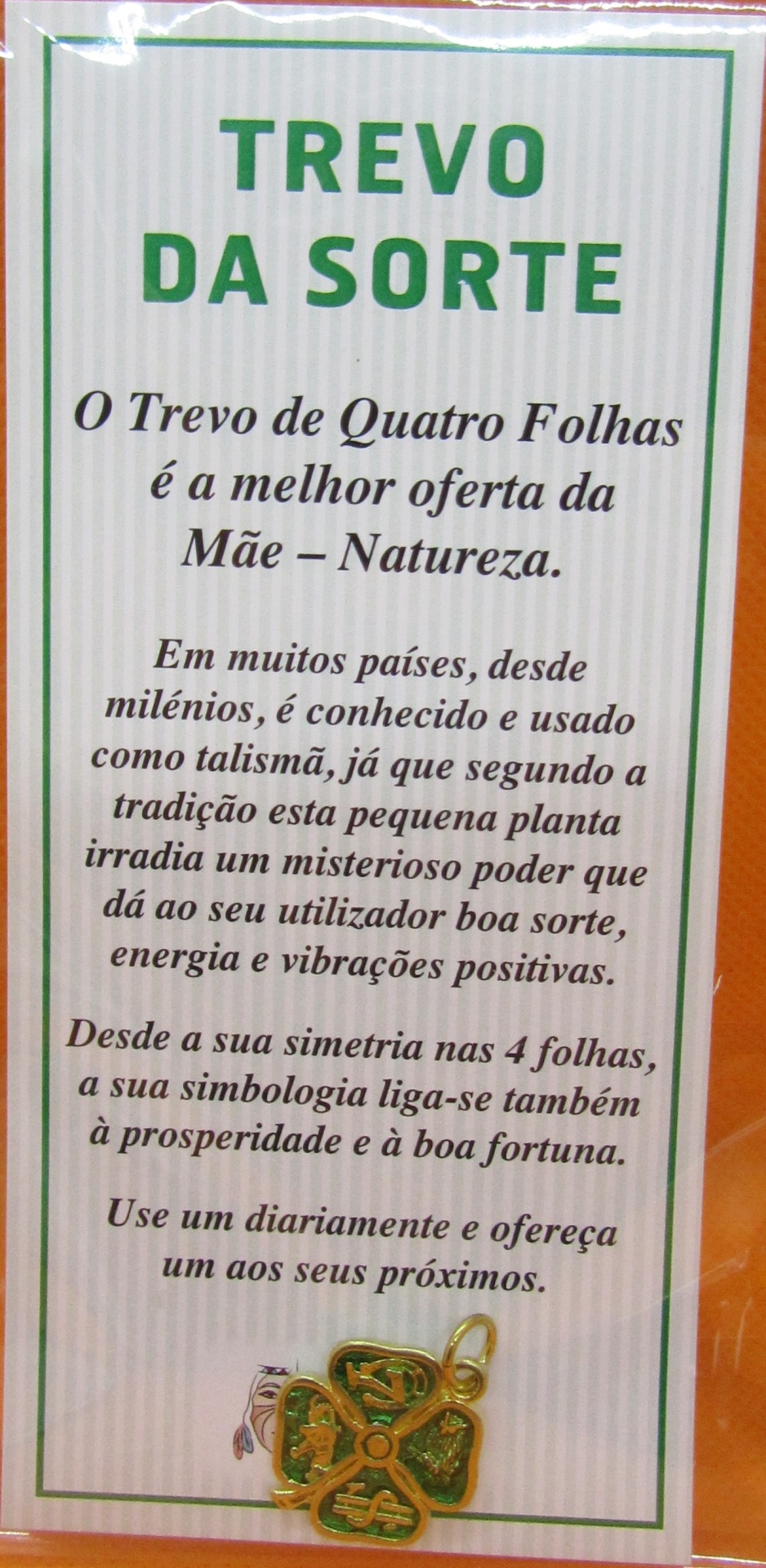 Cartão explicativo sobre Trevo da Sorte com trevo dourado pendurado