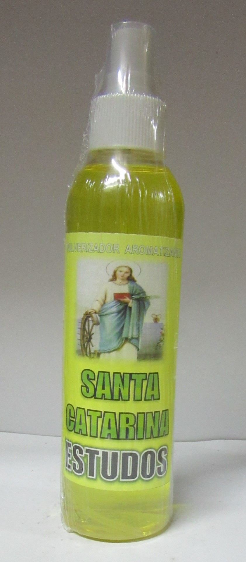 Frasco amarelo com tampa branca e rótulo de Santa Catarina para aromatizador