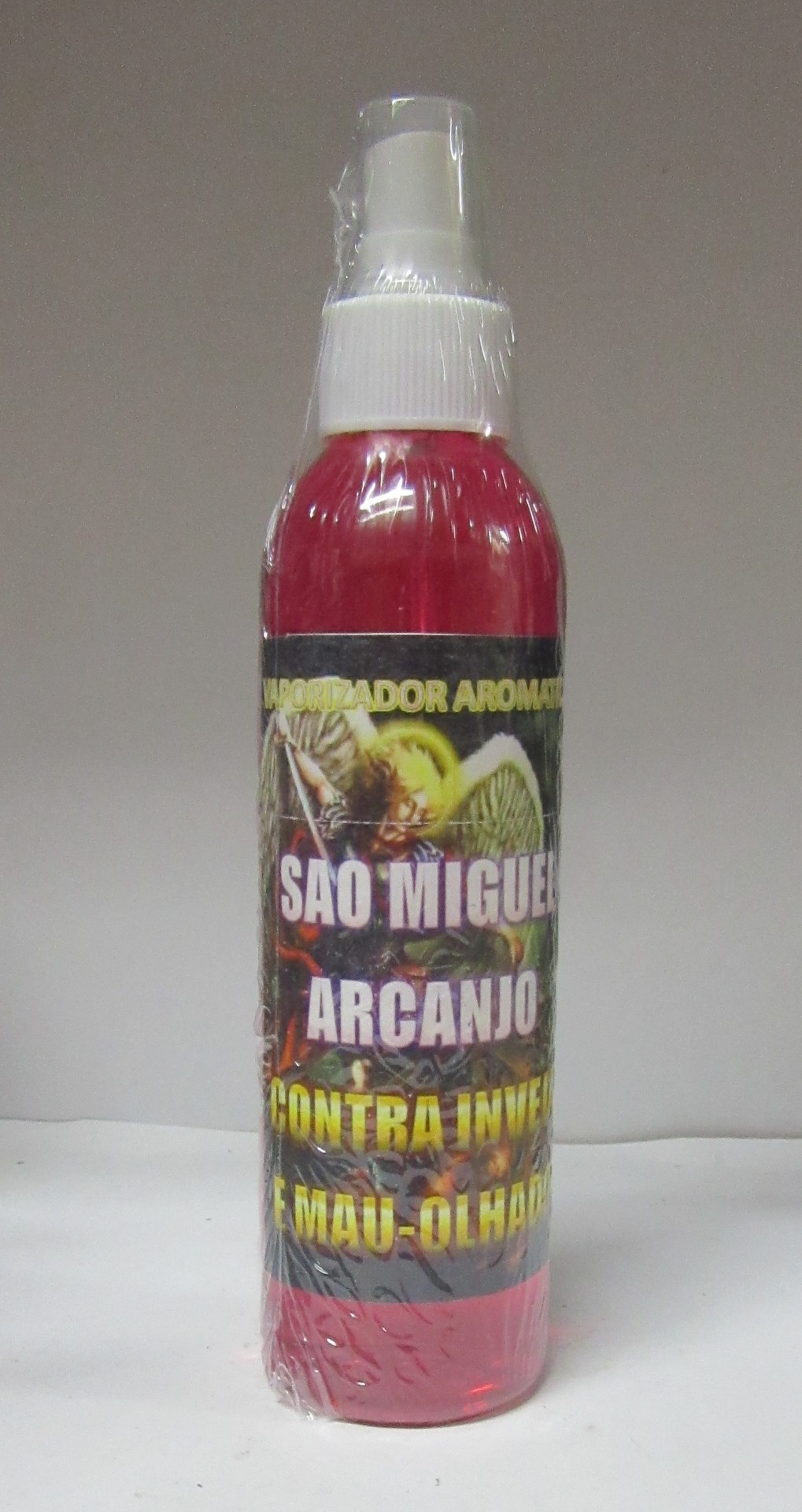 Frasco com borrifador e líquido vermelho com rótulo São Miguel Arcanjo