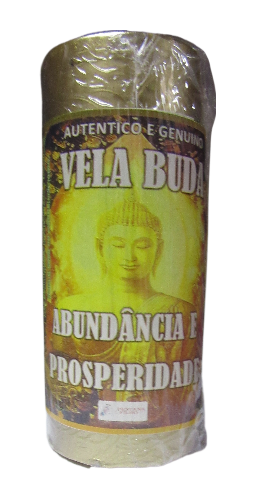 Vela dourada com etiqueta de Vela Budas para abundância e prosperidade