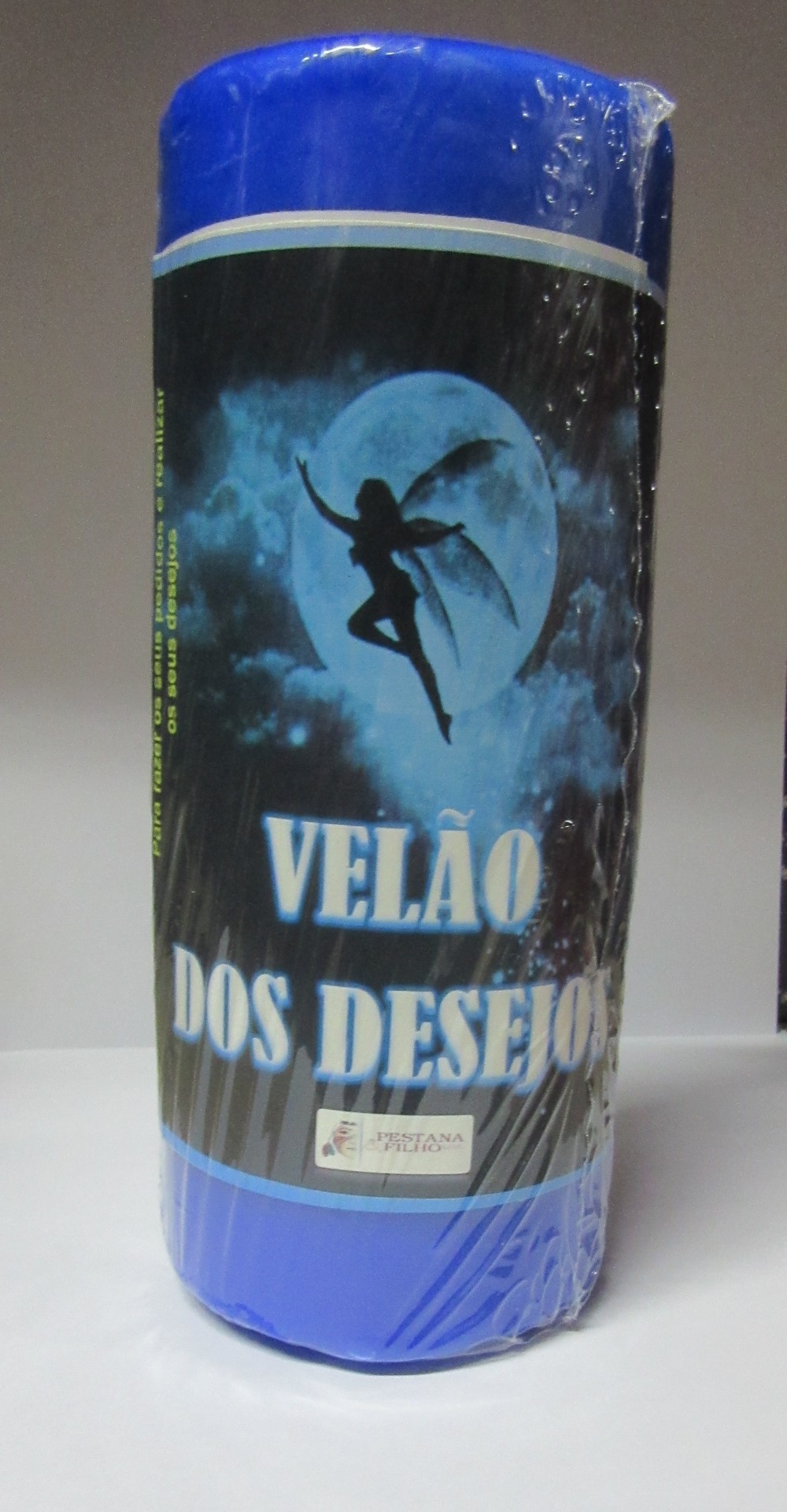 Vela azul com etiqueta preta e texto VELÃO DOS DESEJOS
