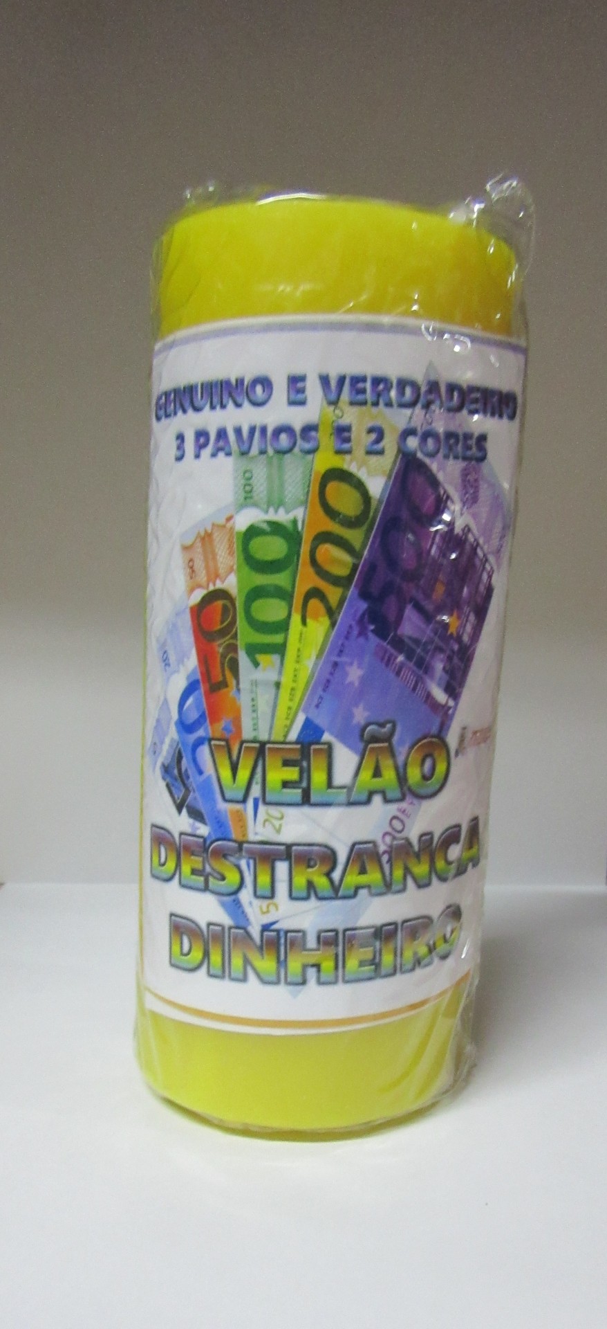 Vela amarela com etiqueta colorida a mostrar textos em português e imagens de papéis-moeda.