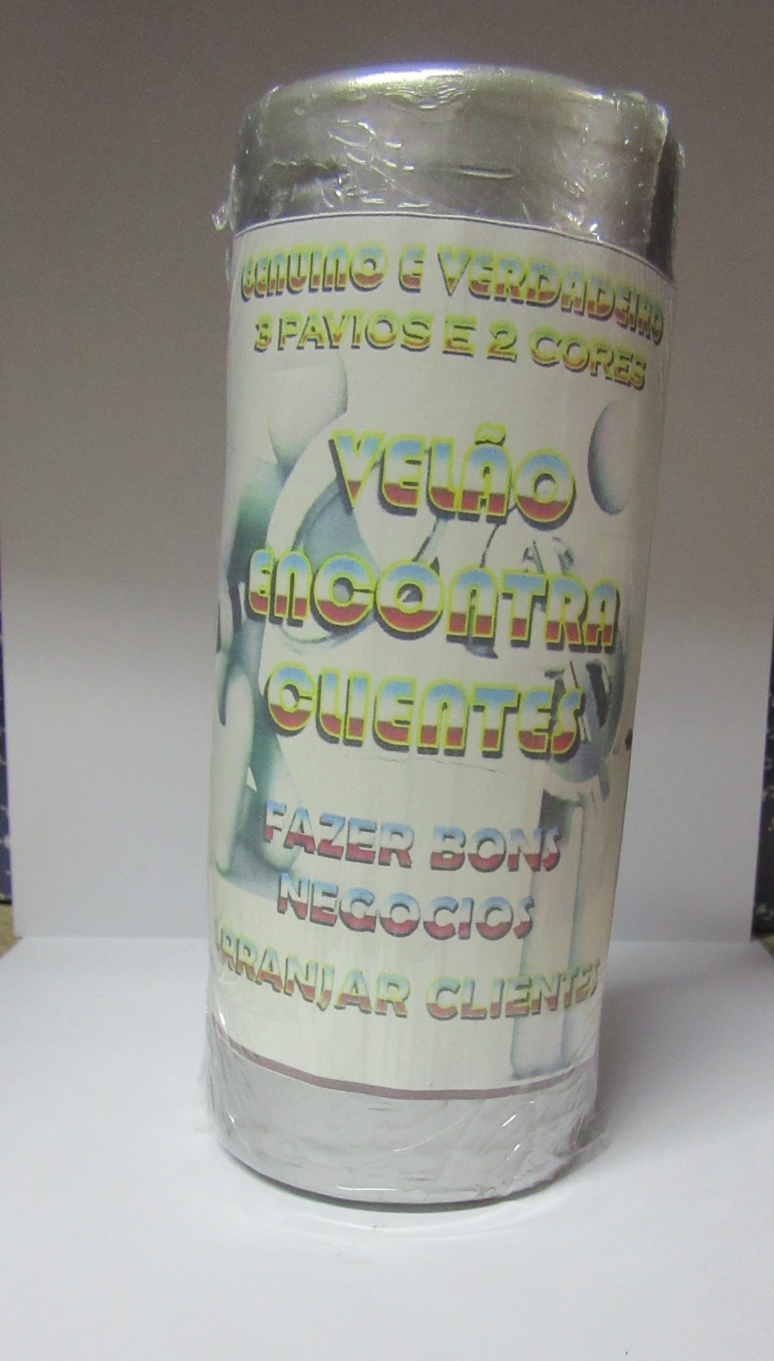 Pacote cilíndrico de velas brancas com texto colorido na etiqueta.