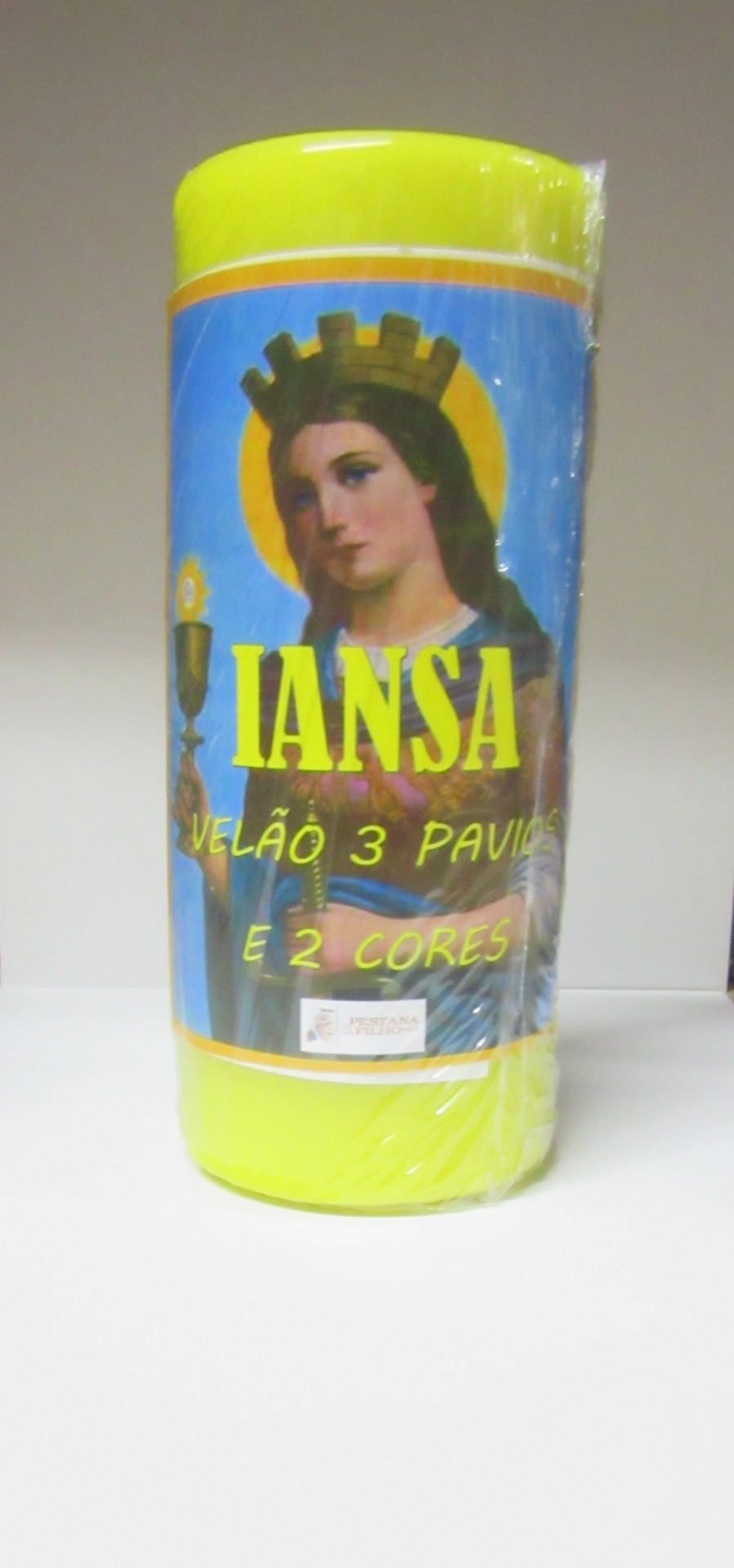 Vela amarela com etiqueta azul e imagem religiosa, texto IANSA VELÃO 3 PAVIOS E 2 CORES