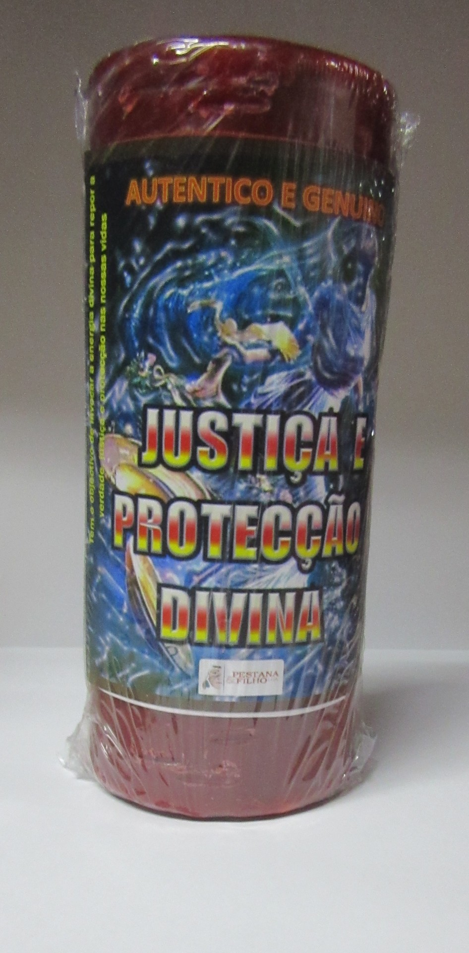 Vela vermelha cylindrical com etiqueta colorida e texto AUTENTICO E GENUÍNO JUSTIÇA E PROTECÇÃO DIVINA