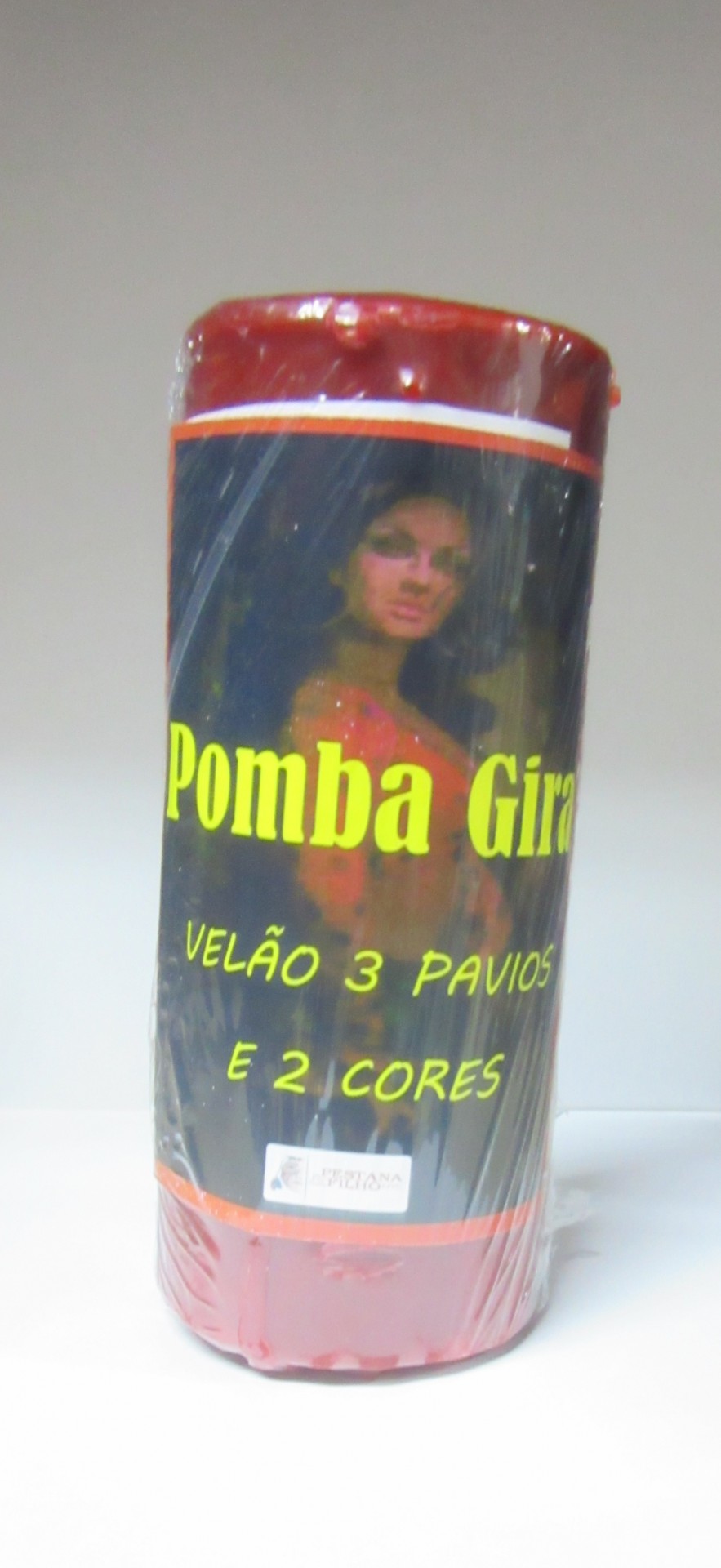 Vela vermelha grossa com rótulo 'Pomba Gira' e texto em amarelo
