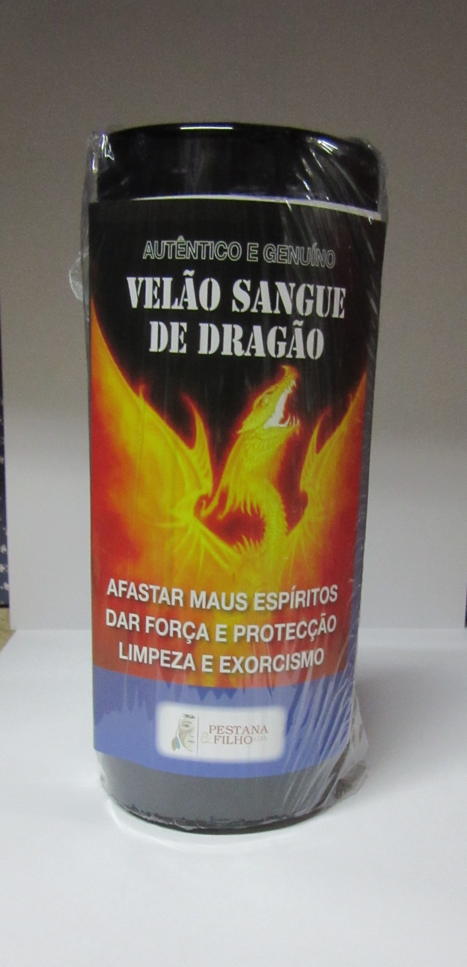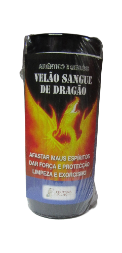 Vela preta com rótulo de dragão em chamas e texto em português