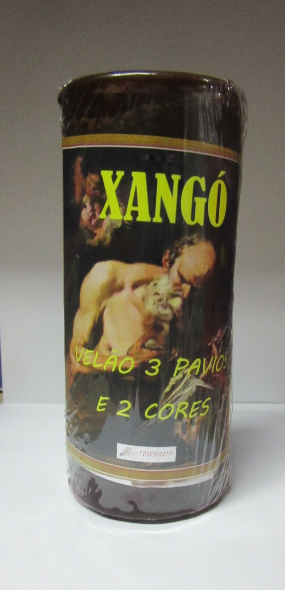 vela tricolor XANGÓ embalagem preta com texto e figura masculina idosa