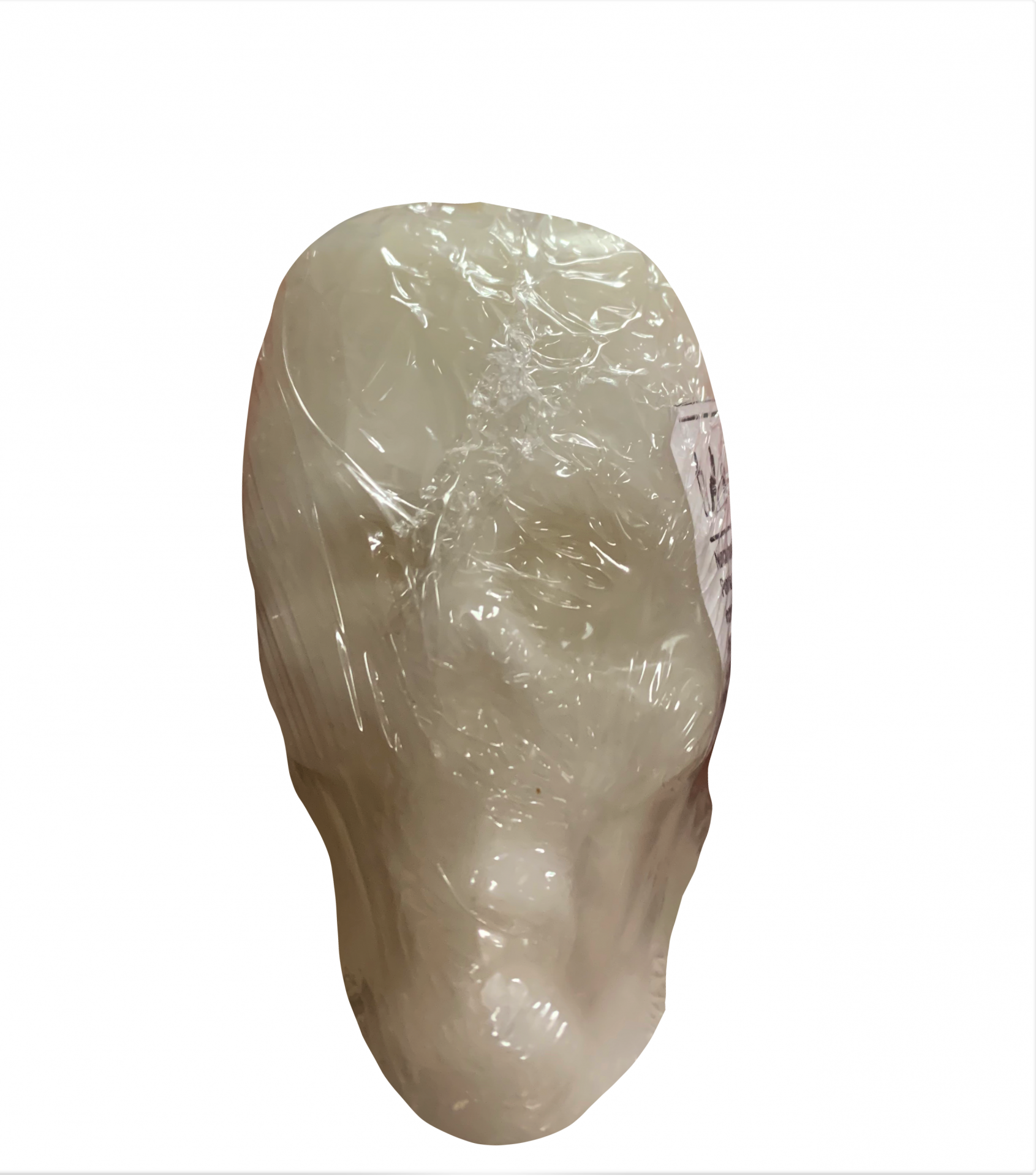 Caveira decorativa branca embalada em plástico transparente