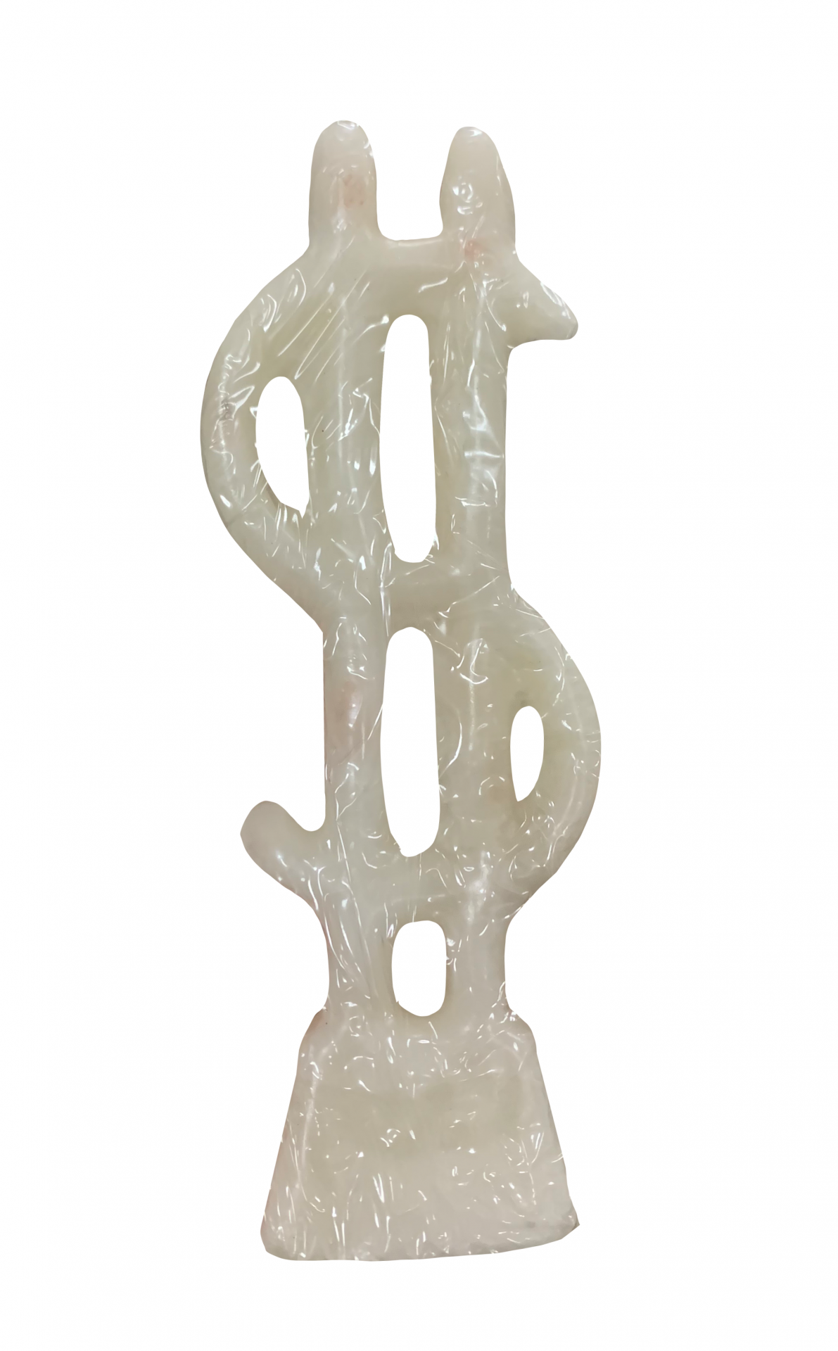 Escultura acrílica branca com textura marmoreada em forma de símbolo de dólar