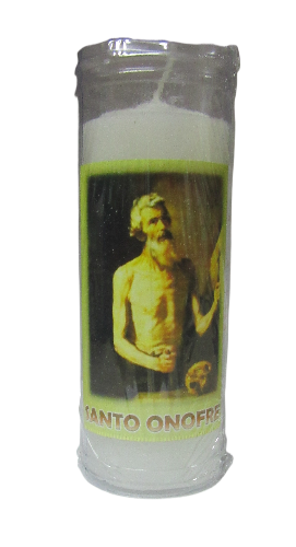 Vela branca em vidro com imagem de santo e texto 'SANTO ONOFRE'