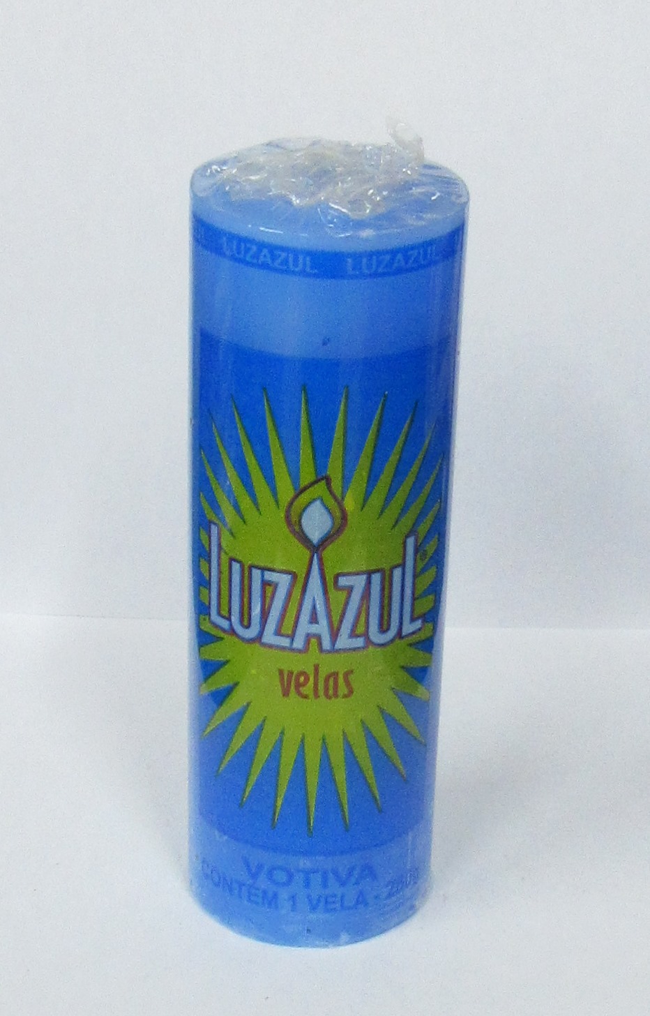 Vela votiva azul LUZAZUL com chama amarela e texto