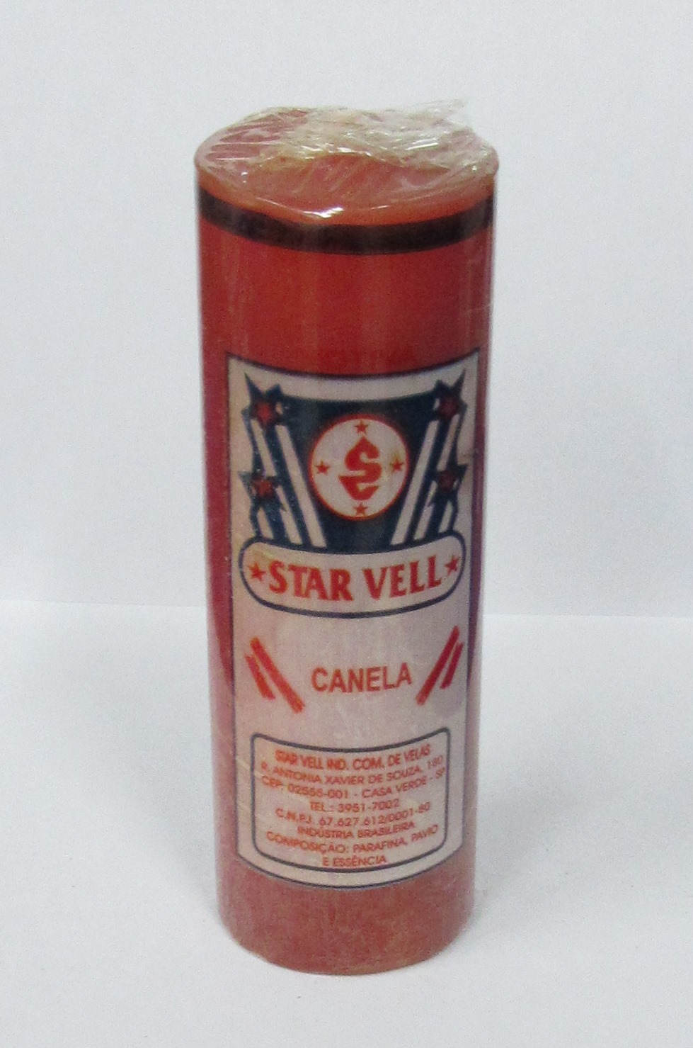 Vela vermelha cilíndrica da marca STAR VELL com etiqueta visível