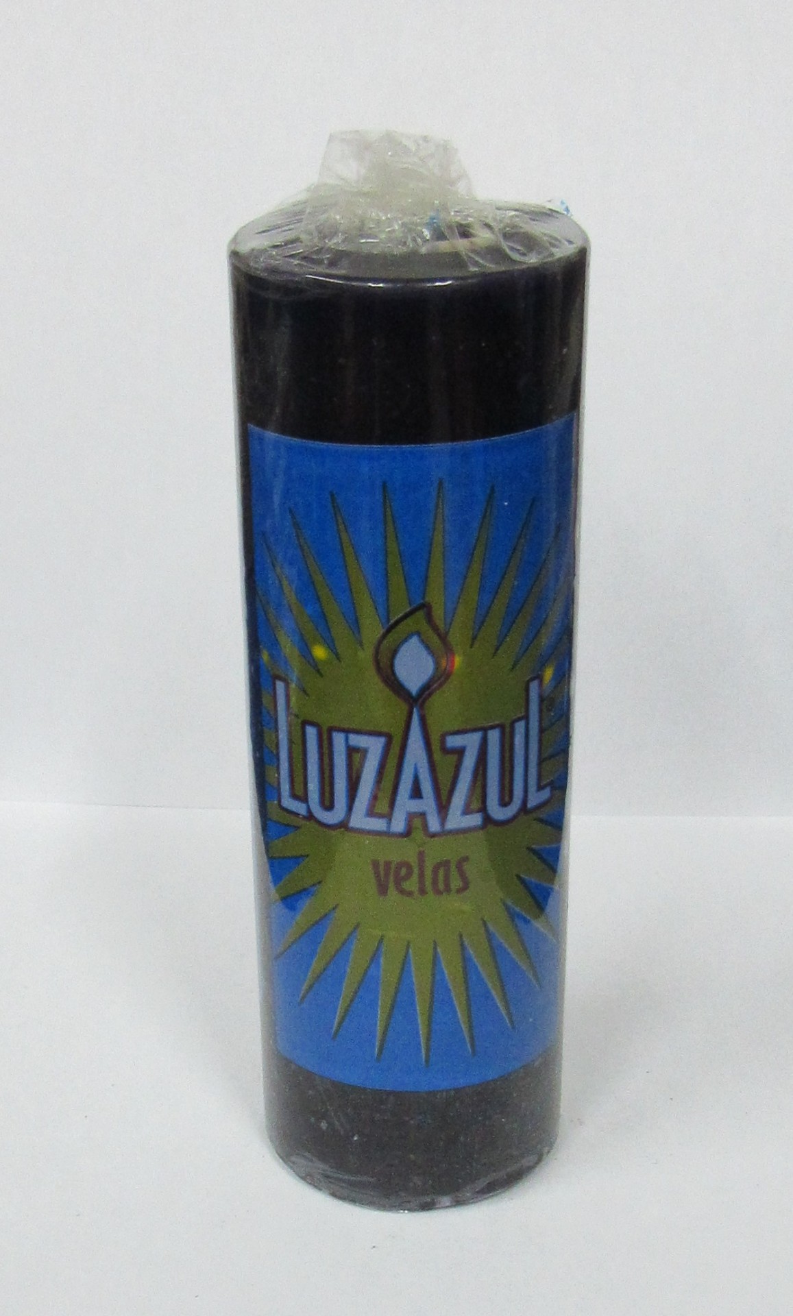 Vela negra cilíndrica com etiqueta azul e texto LU AZUL velas