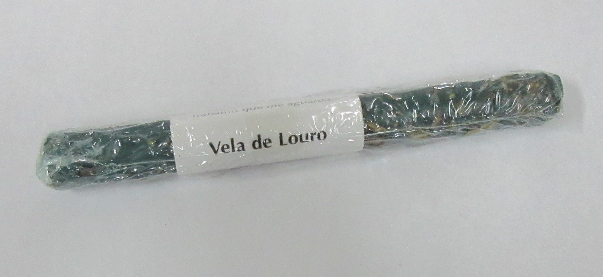 Vela dourada embrulhada em plástico transparente com etiqueta branca Vela de louro