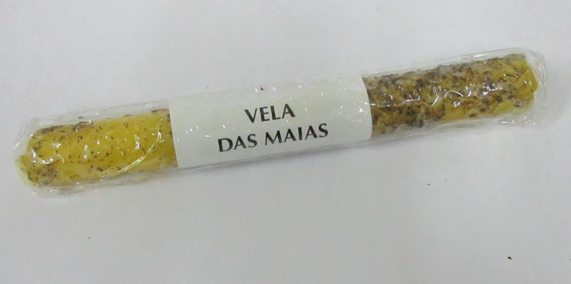 Vela amarela fina com ervas, etiqueta 'VELA DAS MAIAS' em fundo branco