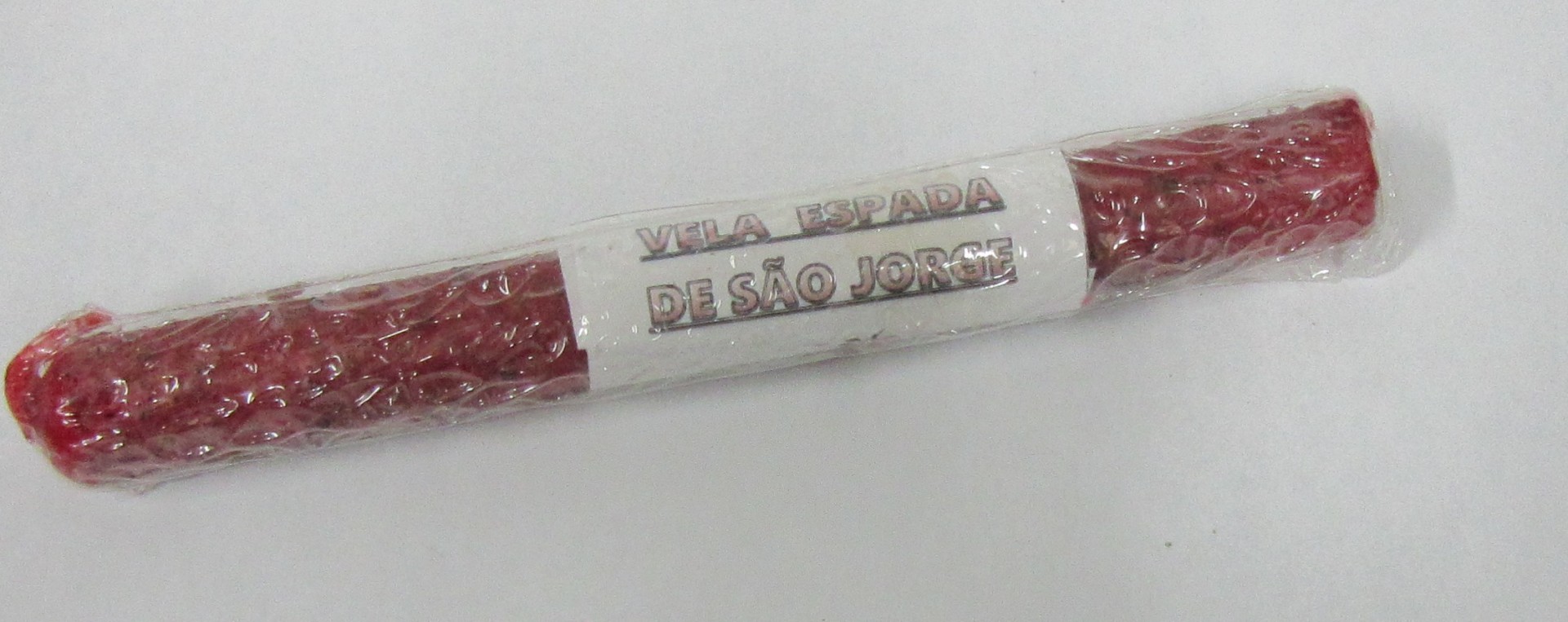 Enchido vermelho embalado em plástico transparente com rótulo branco e texto 'VELA PAGÃ DE SÃO JORGE'