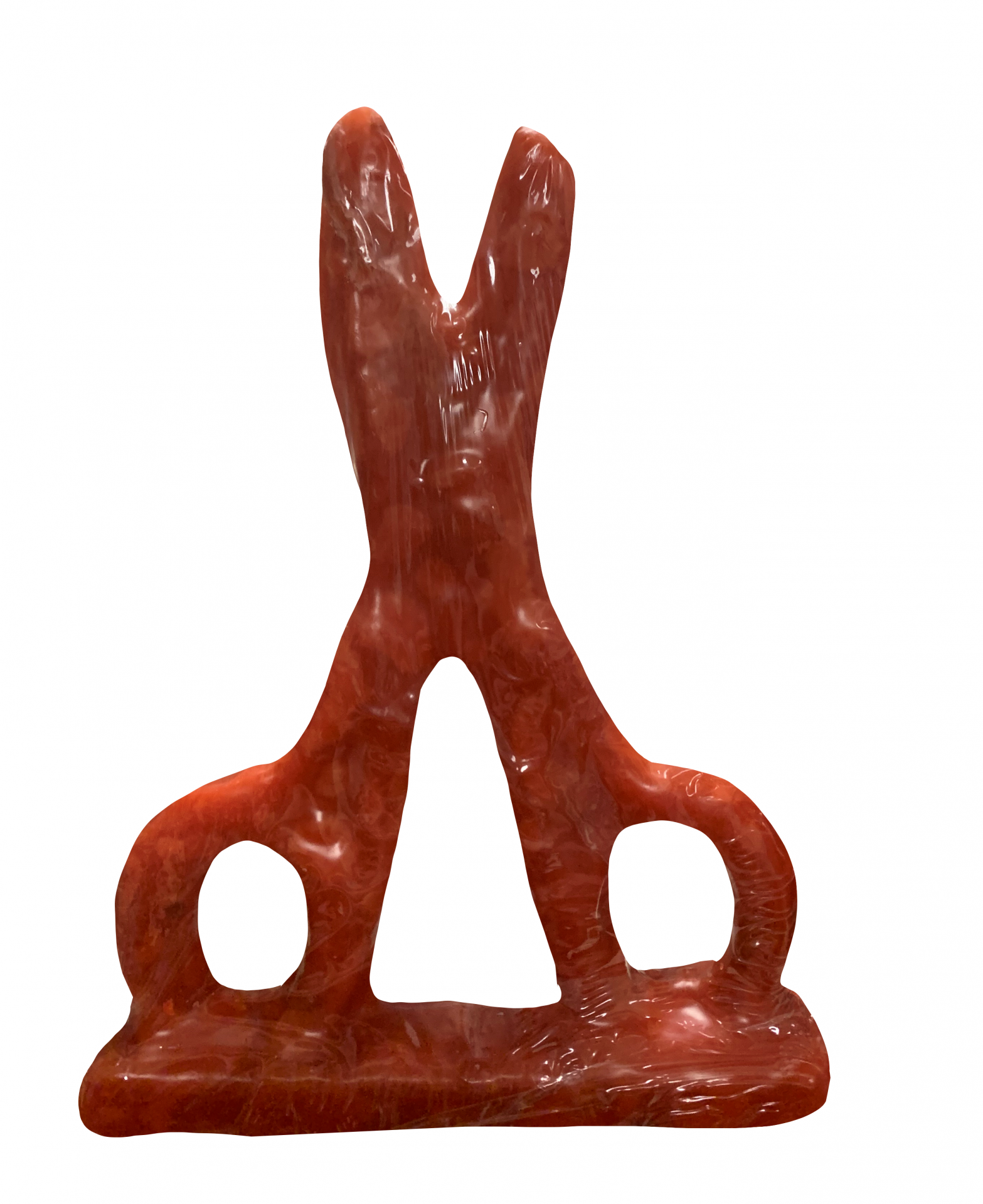 Escultura abstrata vermelha em forma de X com aberturas circulares e triangular
