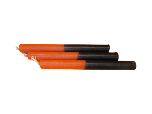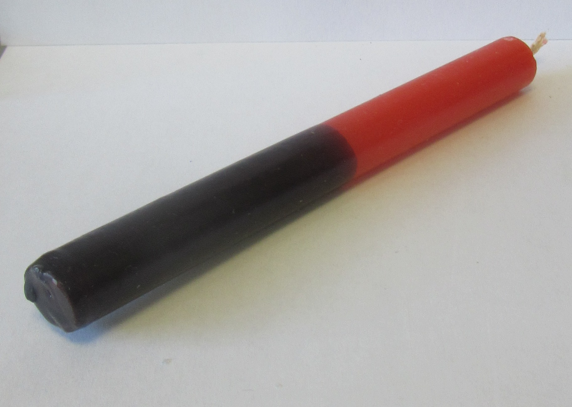 Vela bicolor preta e vermelha com pavio numa extremidade sobre fundo branco