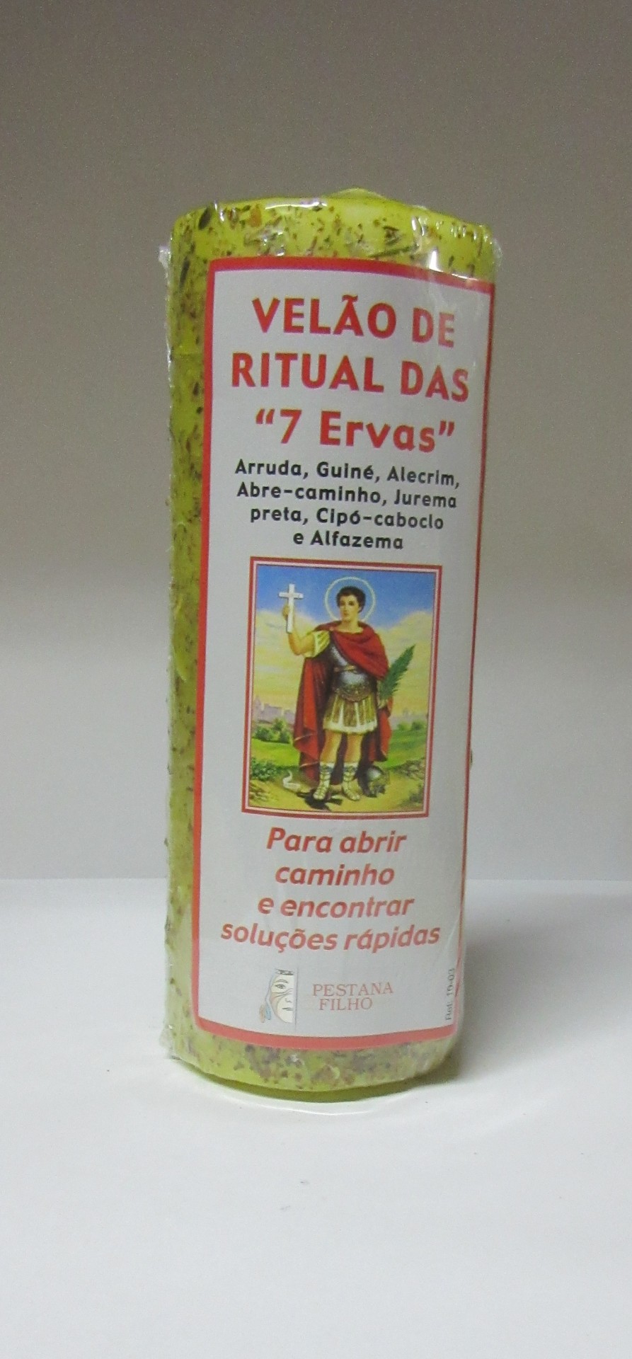Vela ritual 7 ervas com etiqueta e imagem de figura religiosa