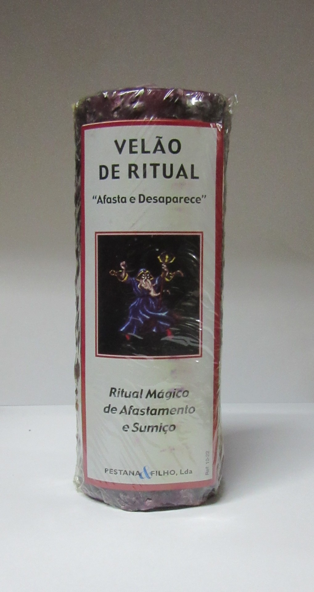 Velão de ritual com rótulo branco e texto preto, figura colorida e embalagem plástica