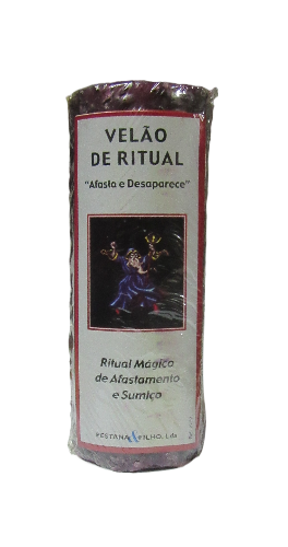 Vela de ritual com embalagem branca, texto preto, borda vermelha e imagem central de figura mascarada em fundo escuro.