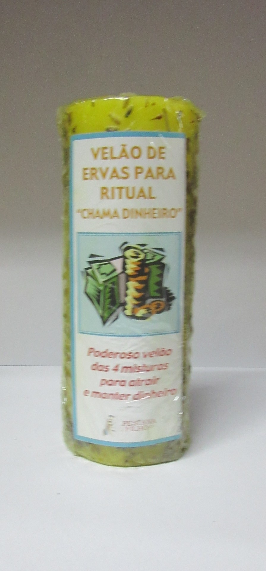 Vela amarela com ervas e rótulo de ritual para atrair dinheiro