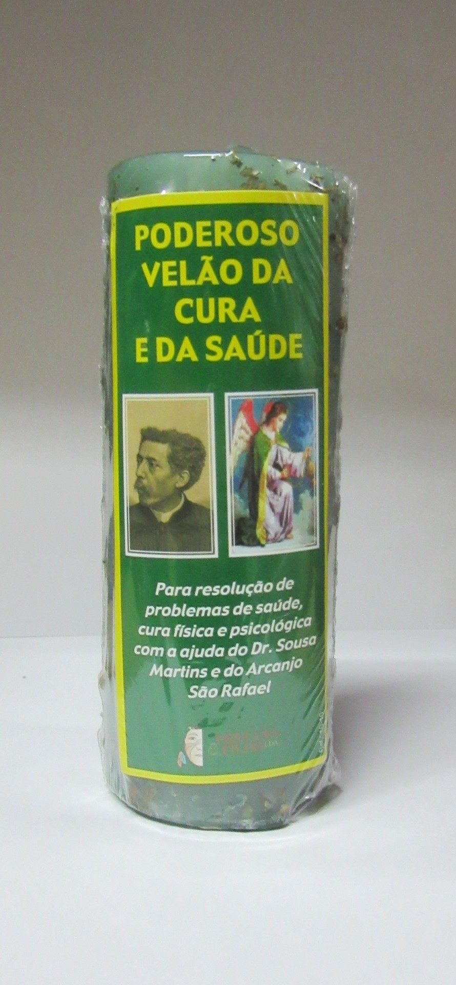 Vela verde com rótulo texturizado e imagens religiosas