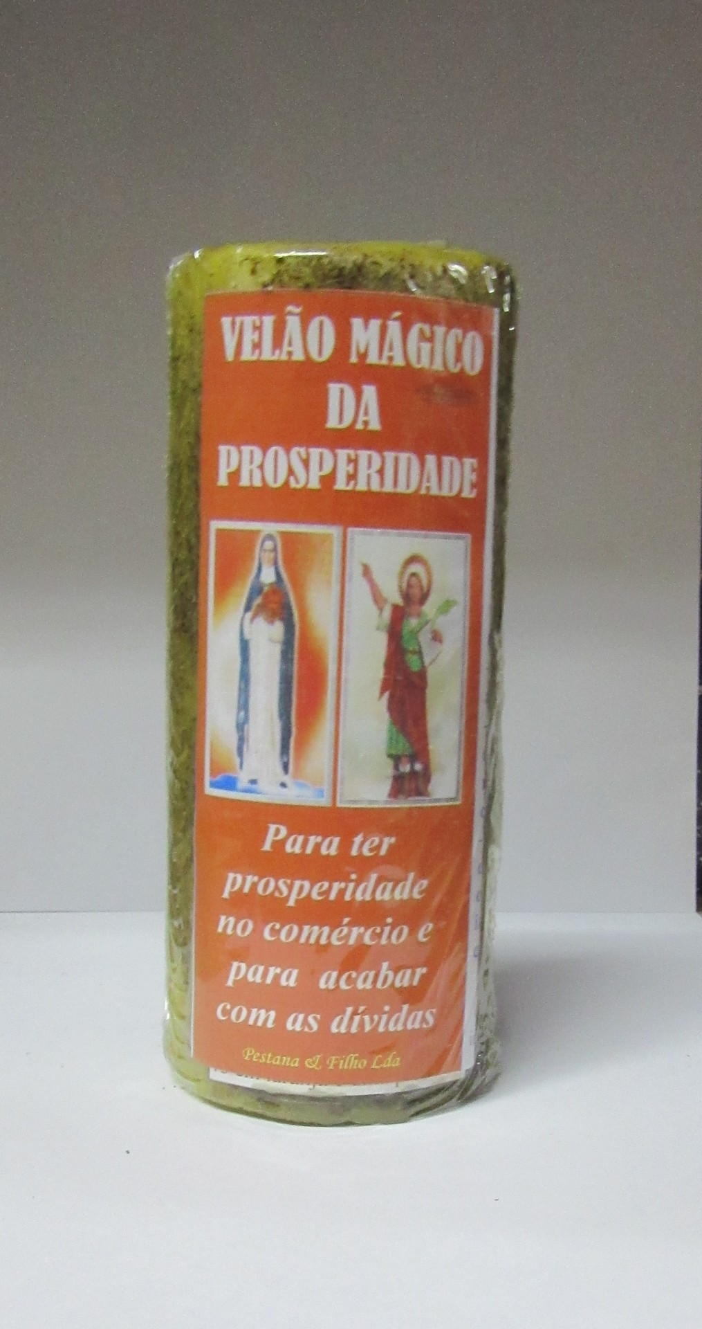 Vela verde com etiqueta laranja e imagens religiosas para prosperidade