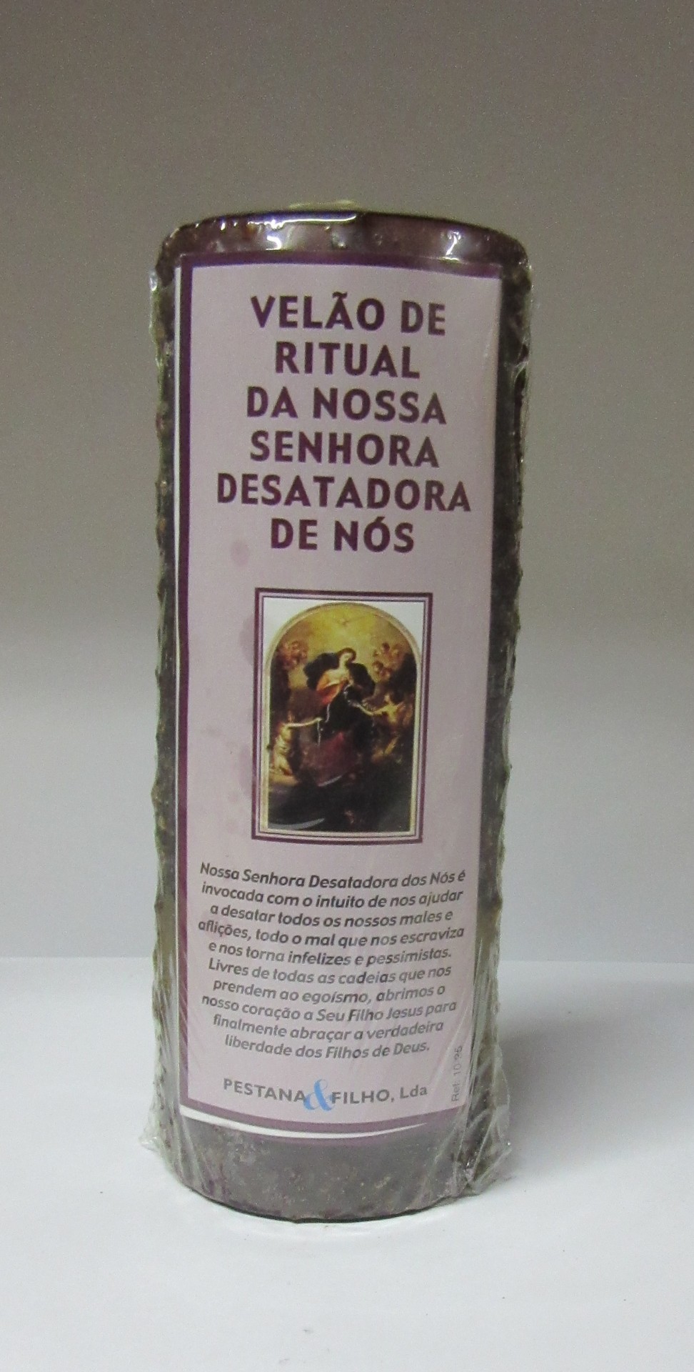 Vela ritual castanha escura com etiqueta branca e imagem religiosa, embalada em plástico.