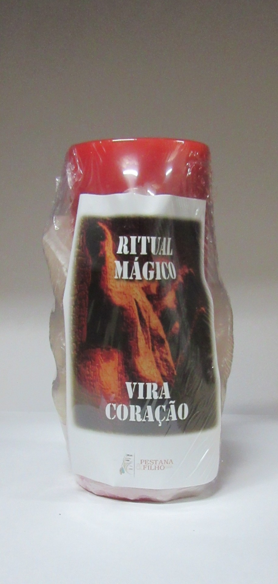 Vela vermelha com rótulo Ritual Mágico Vira Coração