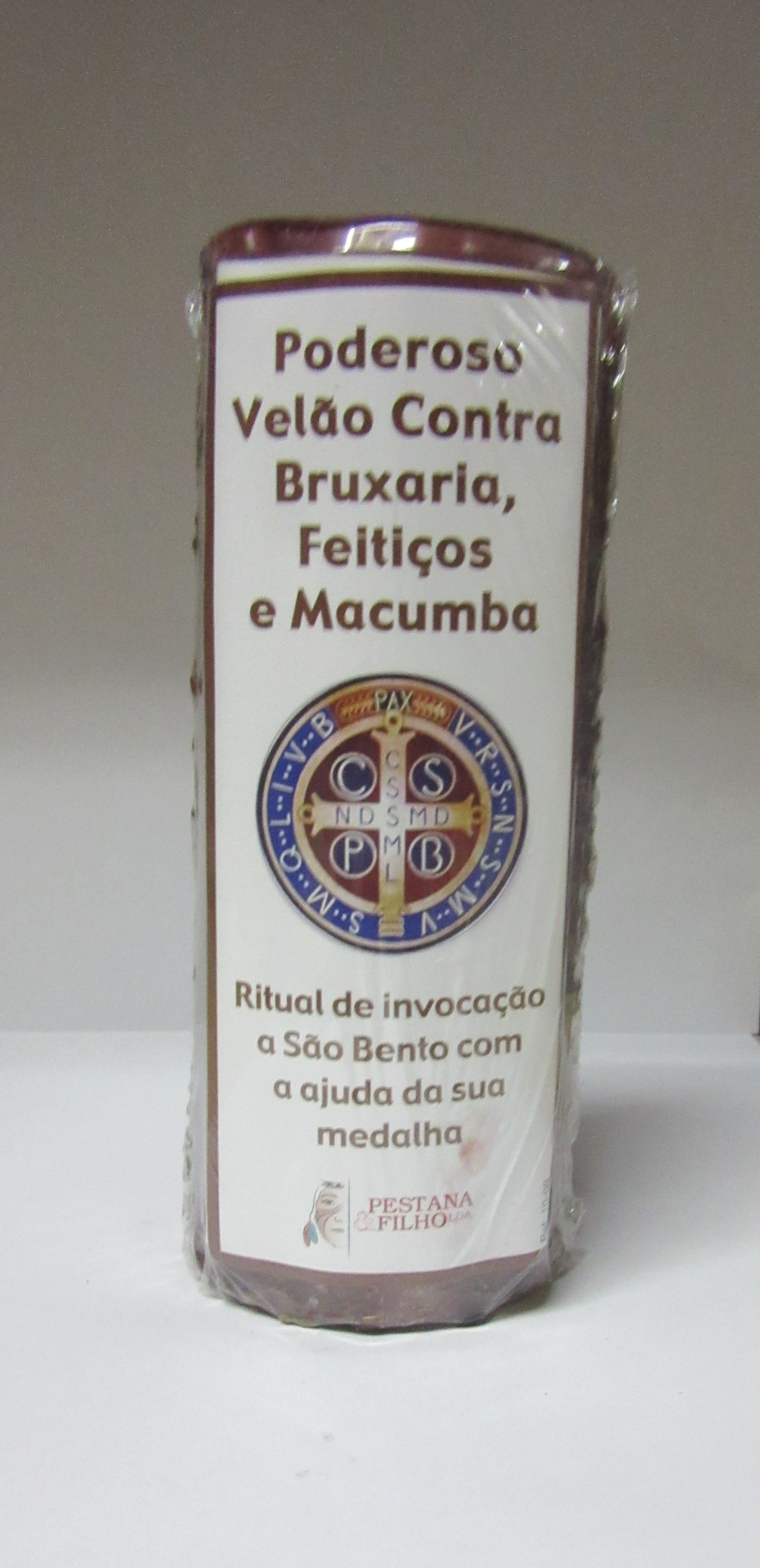 Vela branca contra bruxaria com texto e símbolo de São Bento