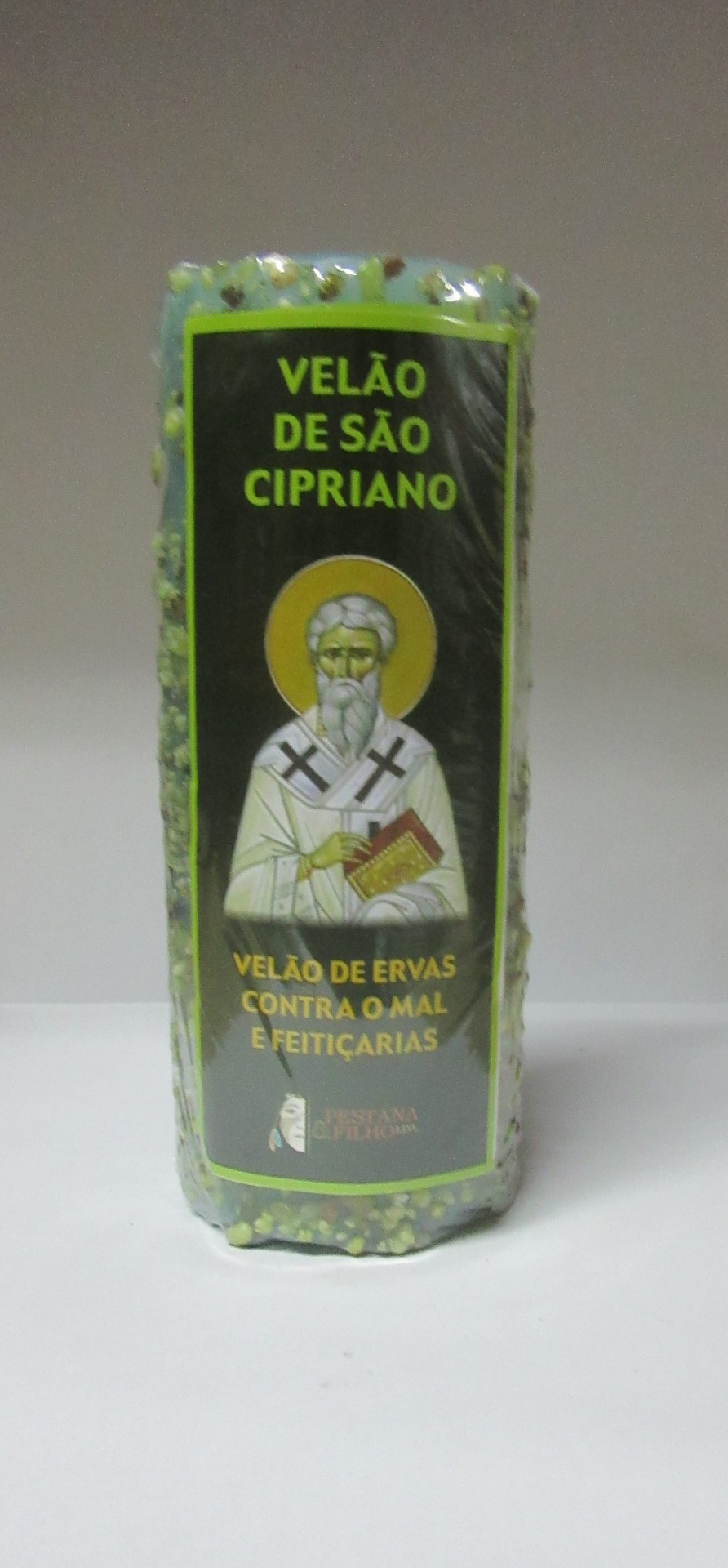 Vela verde com etiqueta preta e imagem de São Cipriano segurando um livro