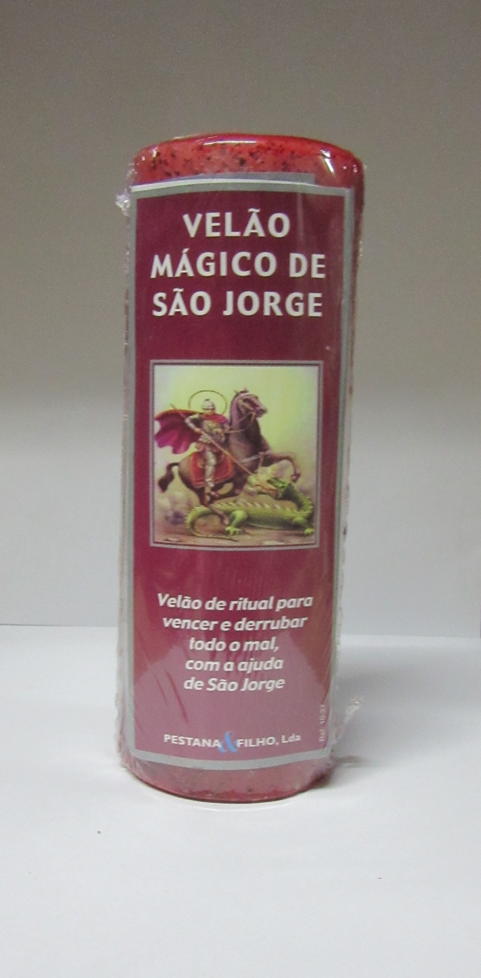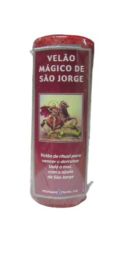 Vela mágica de São Jorge com rótulo vermelho e imagem de São Jorge a cavalo