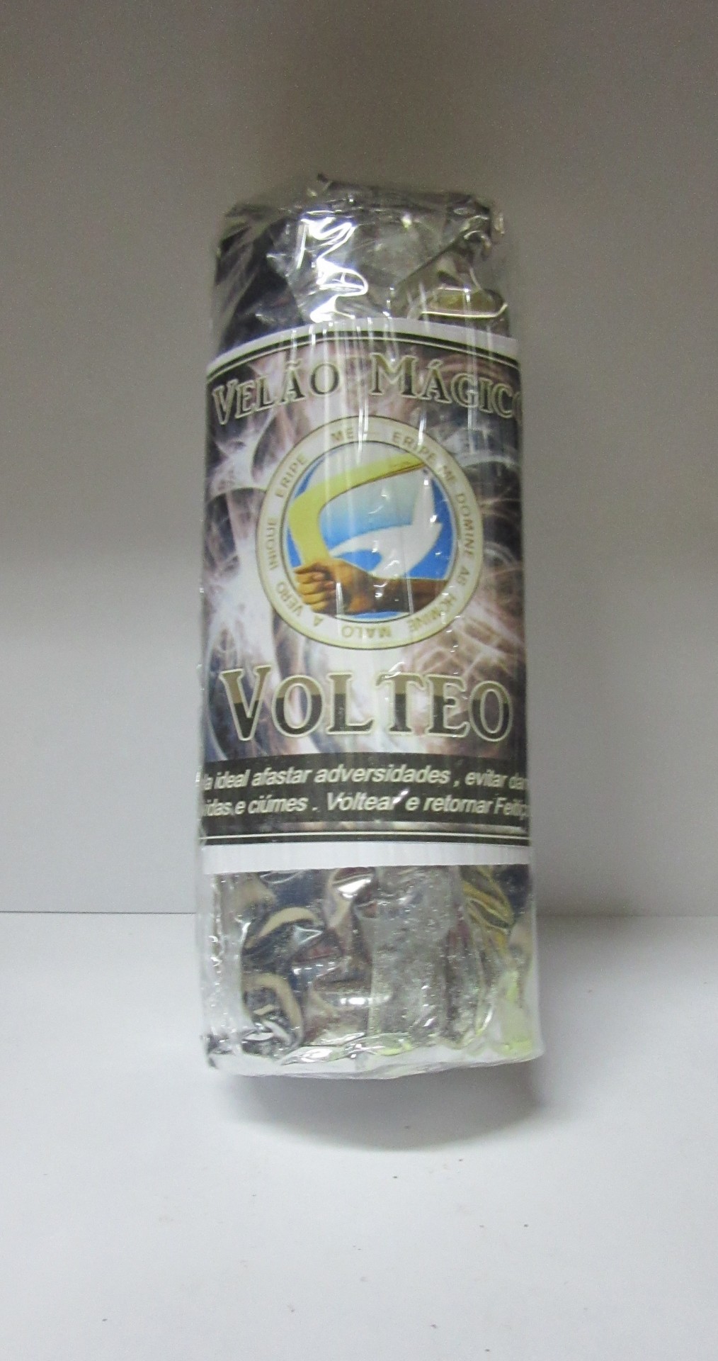 Vela embalada com rótulo preto e prateado com texto 'VELA MÁGICA VOLTEO'