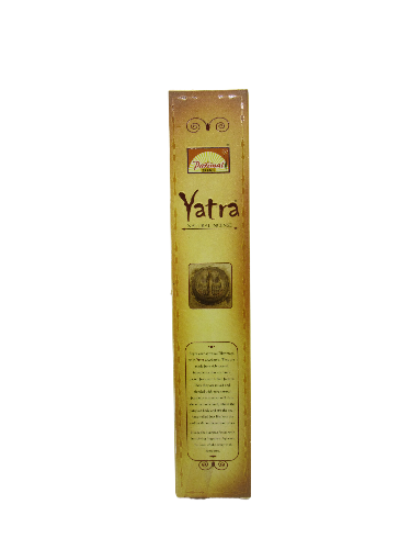 Embalagem comprida de incenso Yatra da marca Patravan em amarelo-bege com texto e selo