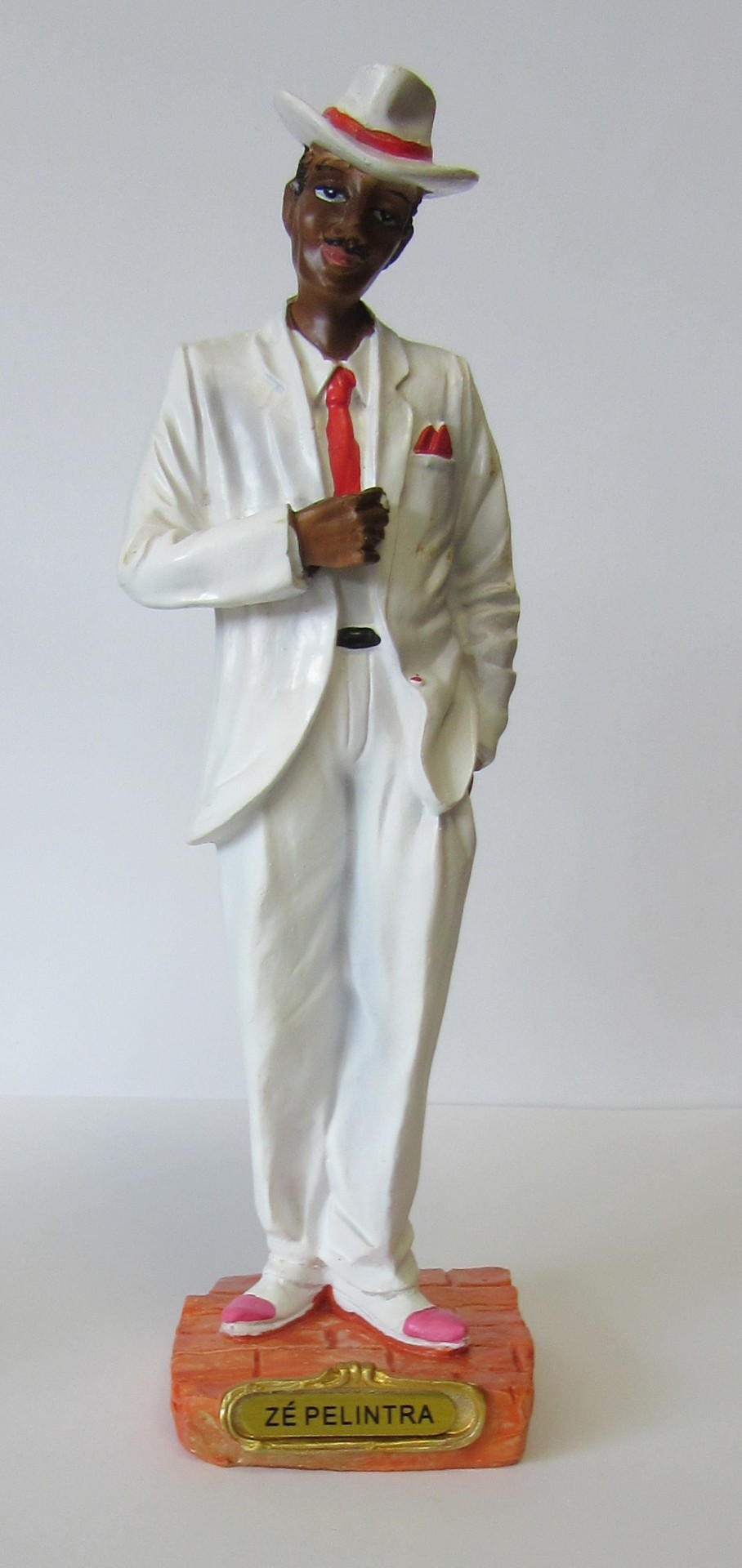 Estátua decorativa de homem com fato branco e acessórios vermelhos